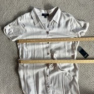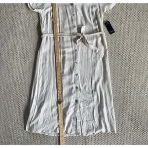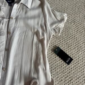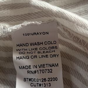 The Naïf dress in size L is a lightweight natural beige long tunic with striped pattern and short roll tab sleeves. It features a collared neckline, button-up closure, and a belted waist. This dress is perfect for various occasions like travel, casual outings, workwear, and business events. Made from rayon material, it has a classic fit and comes with side pockets, making it a versatile and stylish choice for the modern woman.