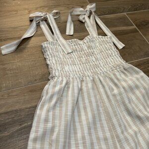 Lightweight (50% cotton, 50% rayon) jumpsuit featuring a smocked bodice and fully adjustable tie strap details.