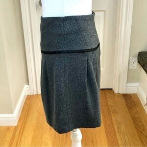 Beautiful gray herringbone skirt, wide waistband, drops to ribbon detail and pleats, short, back zip