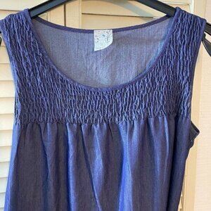 Cool & comfortable sleeveless dress with a denim appearance. It’s cute alone or with a cardigan & accessories.