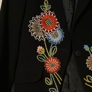 This luxurious black wool blazer from NAF NAF features exquisite floral embroidery, adding a bohemian flair to its classic silhouette. The vibrant colors of the embroidery contrast beautifully against the color, making it a standout piece for any formal occasion. Its cropped design offers a modern twist on traditional blazers, ensuring you make a stylish statement.