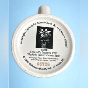 Celebrate the Nagano 1998 Winter Olympic Games with this colorful beer stein from Anheuser Busch. Perfect for any Olympics fan or beer enthusiast, this multi-color stein features the official Nagano 1998 logo and is a great addition to any sports memorabilia collection. Whether you're cheering on your favorite team or simply reminiscing about the games, this stein is sure to bring back fond memories of the historic event. Don't miss out on your chance to own a piece of Olympic history!
