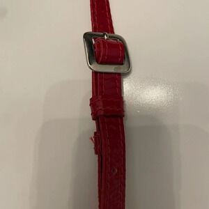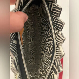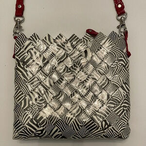 Nahui Ollin recycled candy and newspaper wrapping paper purse. Black and white with red leather double straps. Adjustable leather straps