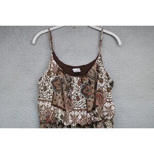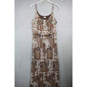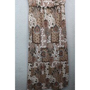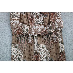 This is a Naif Anthropologie Silky Long Maxi Dress that is a size Small. There is no material tag. Laying flat, it measures: Armpit to armpit-19" and the Length is 57". It is in great condition but a plastic O-ring broke on the backside of the strap and was replaced with a metal one. It works though. Very pretty summer dress. Beachy.