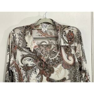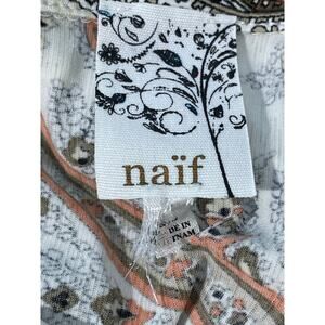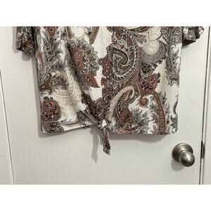 Naif Blouse Small Brown Paisley Stretch Knit Tie Waist Boho Cottage Core, in great condition. Unable to read the size tag, please seen measurements.