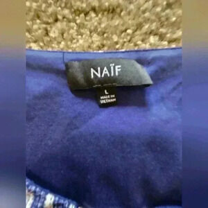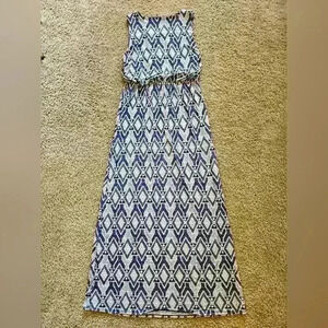 Naif Bohemian Sleeveless Blue & White Maxi Dress w/ Empire Waist, Size Large. This empire waist dress with a geometric print has a bit of extra fabric for a bloused shirt effect. Would look really cute with a belt. There is also a built-in metal detail at the neck, which has almost a necklace feel, like built in jewelry! Very cute, great condition!
