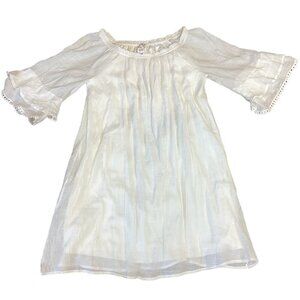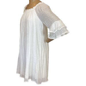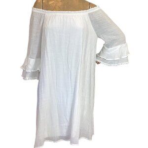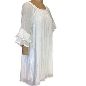 Description: Naif Petites White BOHO Dress/Beach Cover-up. Bell sleeves with Double Ruffle and Pom-pom trim, has lining (not a see through dress. Can be worn off the shoulder as well. Elastic at neckline and very flowy! Versatile - cute as a dress or as a beach cover up.
