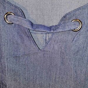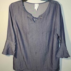 3/4 sleeve denim look blouse with grommet detail. Very lightweight pullover style.