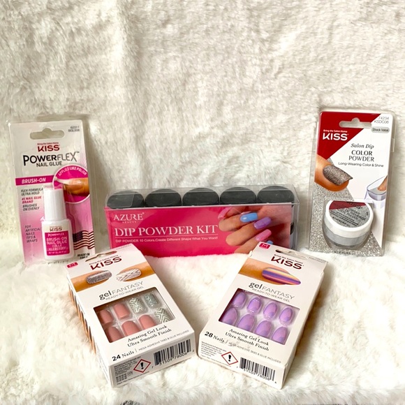 Azure nail dip powder kit, Kiss nail dip powder, nail glue, and two Kiss press on nail sets. Purchased when nail salons were closed due to COVID, but ended up not using these.