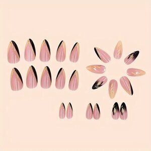 24 Black Gold Glitter Leaf Nails Press On Kit Stipe Line French Tip Glam Vacation