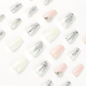 Nails Glitter Fake Press On 24 Trendy Rhinestones Sexy Glam Pink Silver Stylish