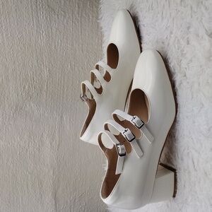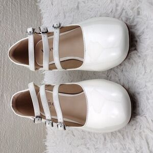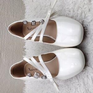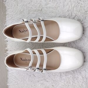 Naiyee Women's White Patent Leather Three Five-Eyelet Buckled Strap Upper Round Closed Toe Mid Blocked-Heel Mary Jane Style Shoes. Man Made Rubber Sole. Light Cushion Leather Footbed. Few Marks Per Photos. Measurement approx. Heel: 2". Size 6.5. Color May Vary Due To Lighting. NWOT