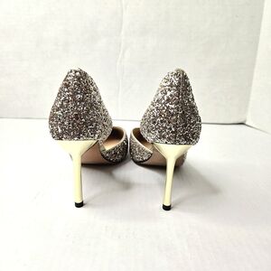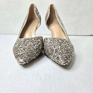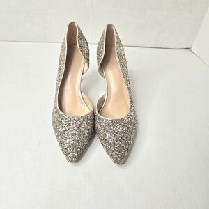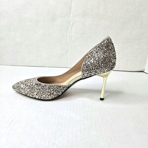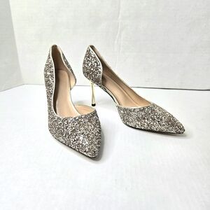 Naiyee high heel pumps. Gold glitter on the body looks like crystals. Gold shiny 3" stilleto heels. Size 235, which is a US 7.