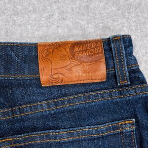 Men's Naked & Famous Golden Hour Slub Stretch Selvedge Slim Straight Zipper Fly Button Closure 5 Pocket Dark Blue Wash Denim Jeans Pants. 98% cotton, 2% elastane.