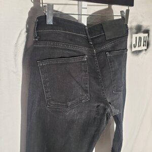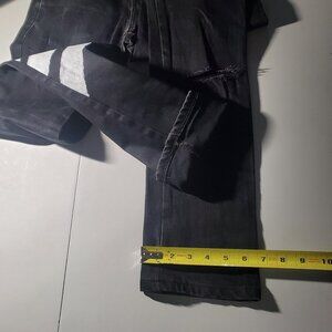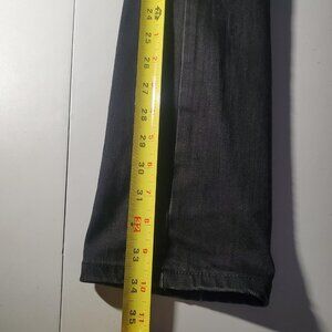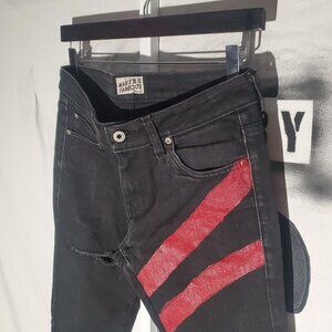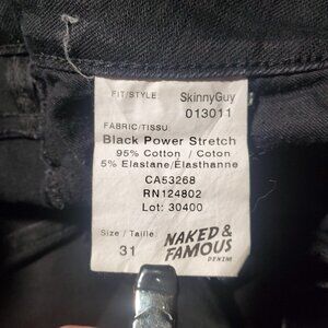 Black Skinny Jeans with painted stripes and distressed/destroyed on front only (2 holes on each side of jeans) - Naked and Famous began in 2008 - all their denim is raw (see below) and Japanese - Made in Canada - denim is 95cotton/5elastane- jeans weigh 1lb2ozs- waist is 31 and inseam is 34 (see pics)