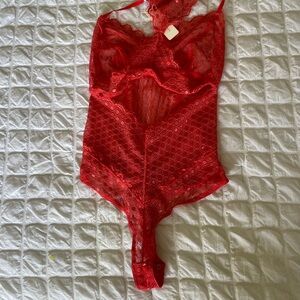This vibrant red bodysuit features a sleek, form-fitting design with a plunging neckline, perfect for adding a touch of elegance to your sleepwear collection. Crafted from a luxurious material, it offers both comfort and style for a restful night's sleep.