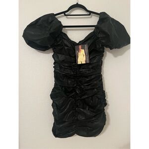 Make a statement in this Runway ruched faux leather dress.  This is a very rare dress and sold for $484 beautiful square neckline that you can wear to any party or cocktail occasion. guaranteed you’ll turn heads in this black body on dress .