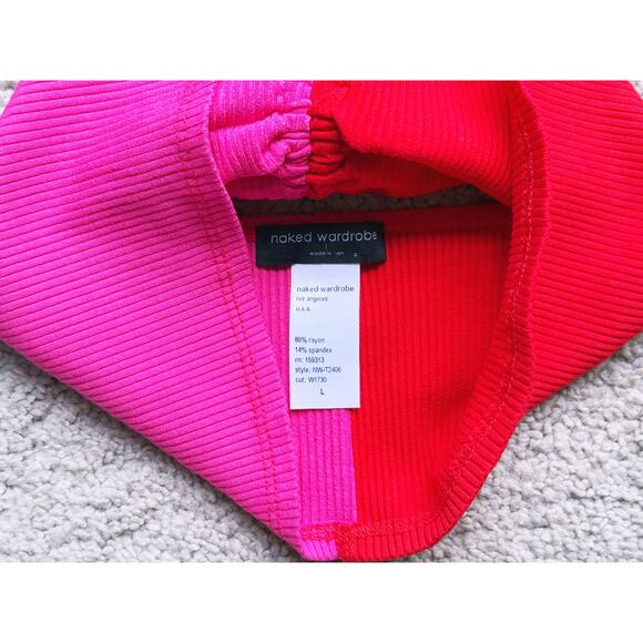 Turn heads in this bold Naked Wardrobe Color Block Crop Top, featuring a sleek tube-halter design in vibrant red and pink. The cropped fit and bodycon silhouette make it perfect for pairing with high-waisted bottoms for a statement night-out look. Size Large.