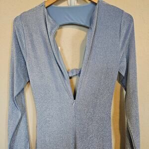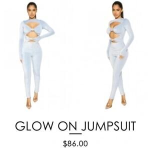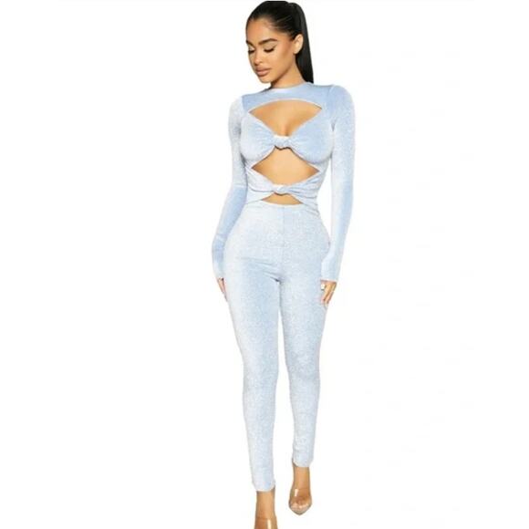 Glow on girllll! This smokin' jumpsuit features a single-tone all sparkle and shine fabric with a high neckline and a double knotted and cutout front bodice. Long fitted sleeves and a body-hugging design that will have everyone turning heads. When you're looking to stand out, this jumpsuit will stand-in. GORGGG.