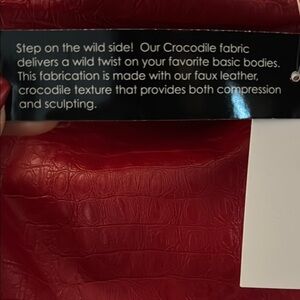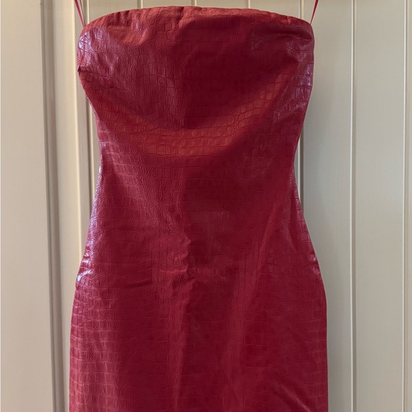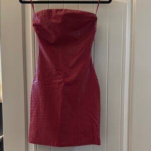 Turn heads with this stunning red strapless faux leather, Crocodile texture dress. Perfect for any occasion, its sleek design offers a flattering fit. Add a touch of elegance to your wardrobe with this vibrant piece.