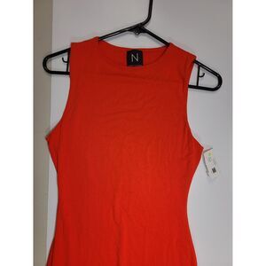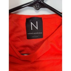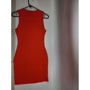 Vibrant and figure-hugging Naked Wardrobe sleeveless bodycon dress in a bold neon orange/red color. This mini dress features a simple crew neck and a smooth, stretchy knit fabric, perfect for a night out or summer party. The dress is a size small. Measurements: The total length is approximately 33 ′′ from the shoulder