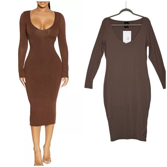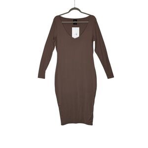 Dark tan/ taupe long sleeve v neck bodycon midi dress. Pull on, fully lined.