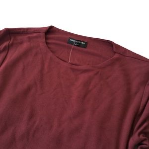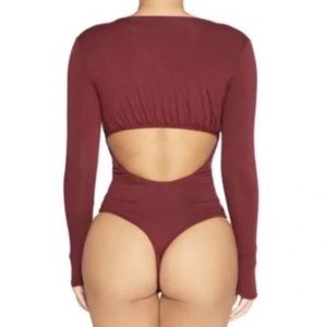 Naked Wardrobe The NW Cutout Back Long Sleeve Bodysuit. Style #NW-B2061 LS CUTO RCH BDST Color: Wine (burgundy red) Cut #w1620. Pullover styling. Open cut out lower back detail has elastic along the top edge of the cut out, but not along the bottom edge. Thong back. Snap crotch (there is only one set of snaps, so the crotch does not have adjustable lengths). Made with Naked Wardrobe’s double-lined “NW Viscose” fabric, which they describe as: 4-way stretch, comfortable compression, subtle crepe texture finish, medium-weight, form-fitting. 95% viscose, 5% spandex. Hand wash cold. Hang or line dry.