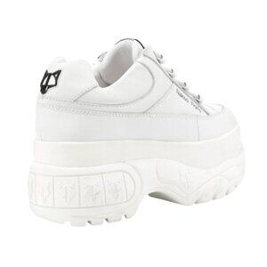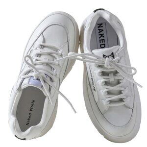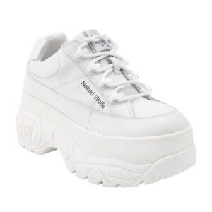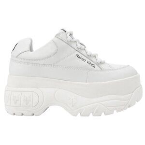 Bold white sneakers by Naked Wolfe. Features a chunky platform. Modern and trendy design.