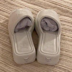 Gorge pair of white slides super super cushy. These run very wide so if you have a wider foot these are perfect. My feet were too narrow and I never wore them. Fits W 9-9.5W. Never out of box. Never worn.
