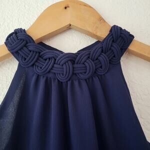 Naked Zebra Cold Shoulder Navy Blue Braided Neckline Top / Blouse. Size Small. Hook closure on back of neck. Approximately 22" Length, 18" Pit to pit. In excellent used condition.
