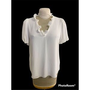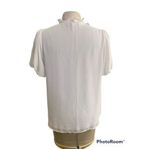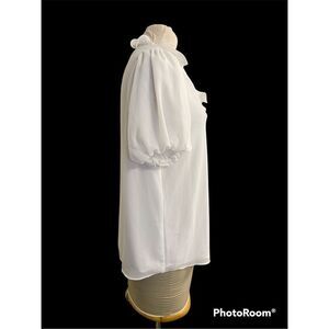 Feminine flowy white top by Naked Zebra. Ruffle neck and puff sleeves create a feminine look. Size L.