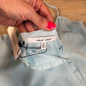Naked Zebra light blue ruffle wrap dress with adjustable spaghetti straps. Tie waist and snap on chest area to keep it closed. Outer layer is sheer with a shiny soft liner underneath.