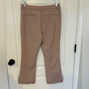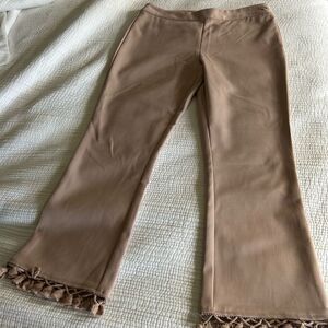 Trendy tan pants featuring a unique fringe hem. Perfect for casual or dressy occasions. Great condition.