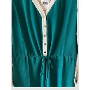 Naked Zebra Tunic mini shirt dress. Very pretty teal and cream color with front gold button accents v-neck. Elastic waist with tie closure. Roll tab sleeves. Sheer sleeves. Size women’s medium.
