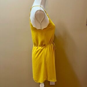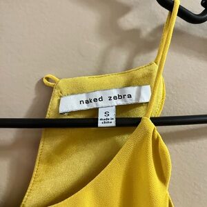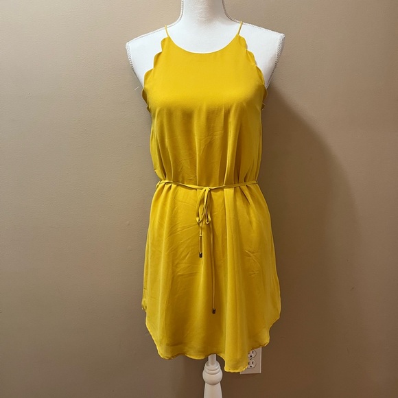Chic yellow dress with scalloped hem and tie waist. Naked Zebra brand. Great condition and the material is 100% polyester. Mini length. A bit lighter yellow in color than pictures show.