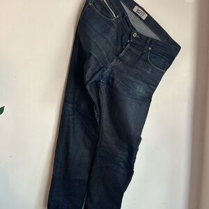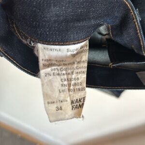 The Super Guy is a slim tapered fit; medium rise, slim thigh and taper from the knee to hem. Discoloration in crotch, as shown in pictures.