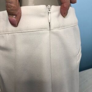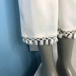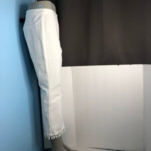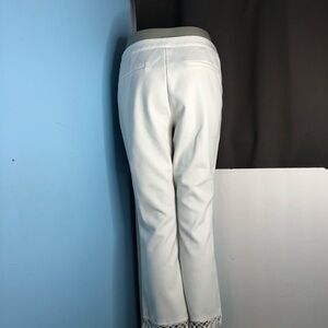 Adorable white cropped pants made of rayon spandex and polyester cool and comfortable with some stretch side zipper beautiful detailing on bottom cuff perfect for your summer wear faux pockets in back size large and washable Full rise approximate measurements
