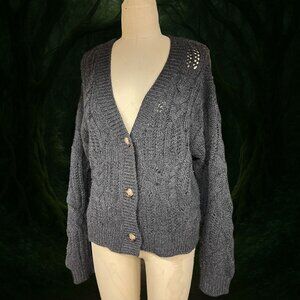 Size L, fits true to size. Boxy fit with 3 button closure and drop shoulder style. Has minor hole in the knit on the back and a small pull on the right sleeve. Not noticeable due to the sweaters open-knit design. The perfect weight for early Fall and to layer into winter.