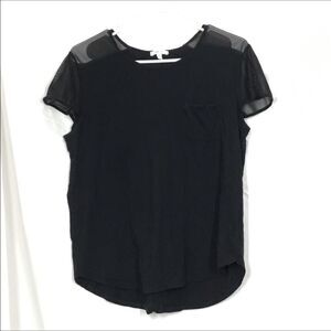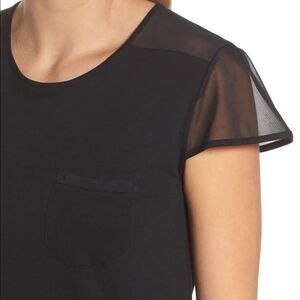 scooped neck; short sleeves; chest patch pocket; curved hem