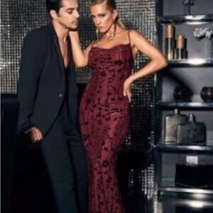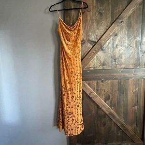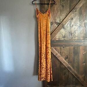 Maxi style dress with attached slip. Toffee color with gold velvet embellishment. Adjustable straps. Dress has stretch. SZ L worn one time to an event and in good condition. Item label is removed. Color in stock photo for style. Item color is gold.