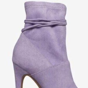 Lavendar purple (wisteria) manmade suede upper, with a wraparound ankle tie, and a pointed toe.