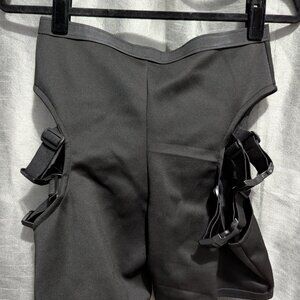 Biker style neoprene shorts with side cut outs and buckles. Branded tag on the front. Elastic at the waist and legs. German club clothing brand that's no longer around.