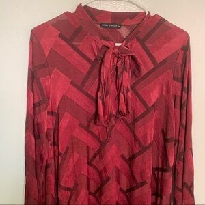 Great condition. Nally & Millie. Handkerchief Hem Tunic. long sleeve. Tie neck. Alternating sheer and solid stripe pattern. Opaque. Missing size/material tag, my best guess on size is a medium; please see measurements to ensure proper fit. Pit to pit laying flat 18” Shoulder to hem 30”/32” Sleeve (pit to hem) 16.5”. All measurements are approximate and taken lying flat. Smoke free home. No trades, offers welcome.