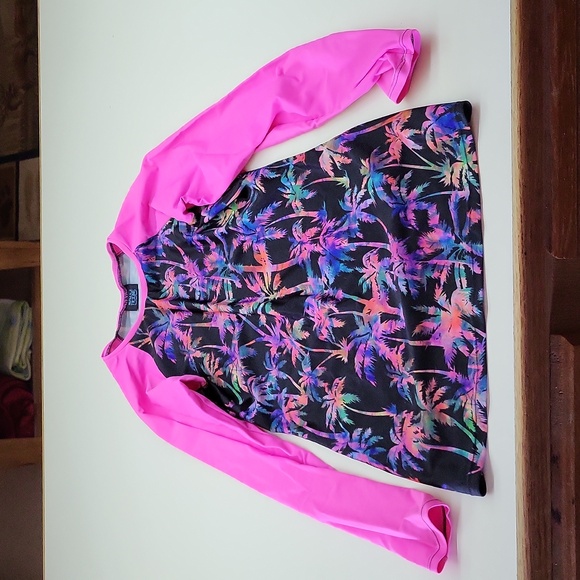 Very gently used rash guard/swimsuit coverup. Size med, but I would say that it is closer to a small or x-small. Colors multicolored palm trees, pink, and black. No holes rips tears or stains.