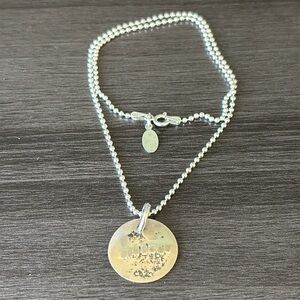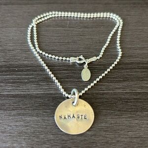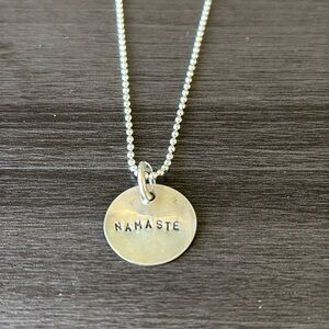 Namaste Handstamped Sterling Silver Pendant on Sterling 15β Ball Chain. Pendant is 3/4β diameter. Spring ring clasp. Chain is new. Pendant is in excellent condition with slight oxidation on the back.