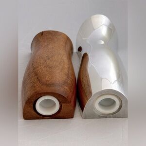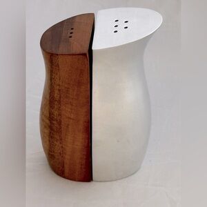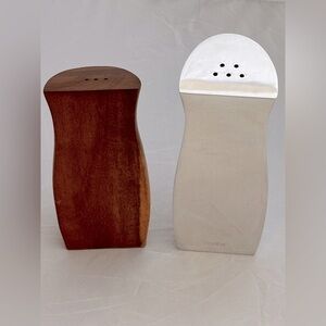 Elegant salt and pepper shakers with a stainless steel and wood design. Perfect for modern kitchens.