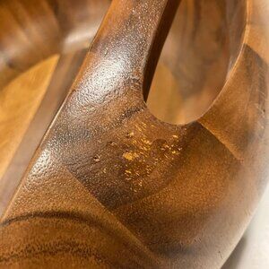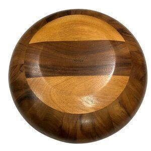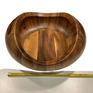 Beautiful and sculptural, this Nambe Pebble salad set adds warmth and elegance to your table. Made from richly grained acacia wood, the set includes a generously sized serving bowl, four individual salad bowls, and ergonomic salad hands that nest perfectly in the bowl’s curved sides. A few light marks near the handle (shown) but overall in lovely pre-owned condition.