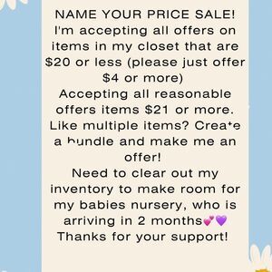 Special sale on all items. Offers accepted for $20 or less. Bundle items for more savings. Perfect for clearing inventory.