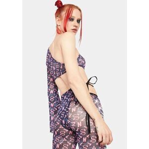 cuz things are about to get frisky! This one-shoulder crop top has a denim print mesh construction, d*ck dollar sign monogram graphics all over, front cut-outs with O-ring hardware, an adjustable side tie closure, and one long sleeve with a "c*m & play” rhinestone motif.