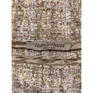 Beautifully woven, multi-textured. Dramatic cowl neck. Golds, creams, light pink, and sequins. Super soft, gold suede-like fringe at the bottom. “N” pendant on the back.